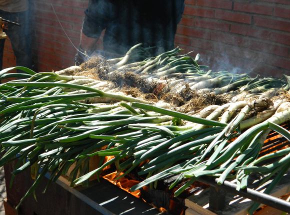 A Catalan specialty - calçots - are a type of long green onions that are milder and larger than regular onions. They are usually barbecued and served with Romesco sauce or salvitxada. There is even a gastronomical event, called 'Calçotadas', which takes place in early spring, when the calçots are in season. A huge lot of them are eaten during this period. To make them tender, the calçots are usually wrapped up in a newspaper. As a custom, calçots are served with local sprinkling wine, called "cava".