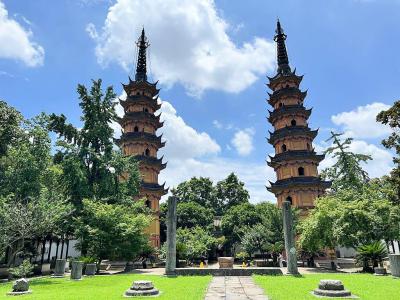 The Twin Pagodas of Suzhou stand as the most prominent survivors of the former Dinghui Temple, once an influential Buddhist complex with a history stretching back more than a thousand years. Constructed in 982 AD during the Northern Song period, the pagodas were funded by Wang Wenhan and his brother and originally formed part of a temple known by several names over the centuries, including Banruo, Luohan, the West Temple, and finally Dinghui. Although the temple was repeatedly rebuilt after fires—most notably in the late Yuan dynasty and again after its destruction during the Second Opium War in 1860—it never regained its former scale. Today, scattered columns, plinths, and decapitated statues from the Tang era offer a quiet reminder of the site’s long and layered past.