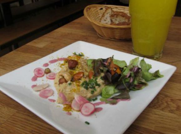 Situated in a former tap factory 500 meters from Canal Saint Martin, this light and airy café serves organic vegetarian food in an uncluttered setting. It can get busy though particularly on Saturdays and Sundays when a generous brunch buffet is served until 16:00. The buffet comprises 4 hot dishes, grain-based salads, samosas and felafels, a salad bar, small cakes, fresh juice and tea and coffee. A la carte dining, organic wines and fresh juices are available throughout the rest of the week. Metro line 11, Goncourt.