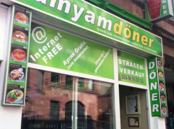 Who still eats Döner Kebabs? There was a time in the 1980s when a Döner was an excellent, fortifying, tasty, fast-food alternative, but the only people in Frankfurt I know who consume the Turkish-German invention on a regular basis are young folks who just need something heavy and cheap before a night of drinking. And who don’t mind the obligatory, sticky garlic sauce, the oddly greasy-dry meat that wedges between your teeth for hours, the sad salad… So you might think calling Yam Yam "best in town" is akin to damning with faint praise. But actually, it is quite good. The "Yam Yam Döner" my girlfriend tried, with fried onions, was juicy, non-stinky, with pleasant toasted bread and clean greens. I opted for the veggie Döner, with goat’s cheese instead of meat, and was impressed with the fried/grilled vegetables and general wholesomeness of the thing. The sauce that ran into my hands was not unpleasant, and easy to wash off.