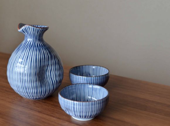 A sake set is a generic term for a jar and cups used for serving Japanese alcohol, Sake. Sake vessels are made of ceramic and feature asymmetrical designs. Sake can be served in many different cups, including: saucer-like cups, called sakazuki; small cylindrical cups - ochoko; and masu - wooden cup boxes. Additionally, to chill sake, they use choiori. The sake “server”, included in the set, is called tokkuri and is traditionally shaped like a vase with a narrow neck to prevent heat from escaping. The wooden box is used for additional sake liquor to serve as a “spill-over” dish. Sake is quite popular among tourists in Japan, and can be found in Tokyo at Oriental Bazaar. More expensive and intricately made sake sets range in price between $100 and $200.