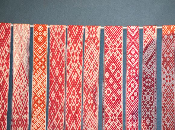 Lielvārde Belt is a unique element of the Latvian folk costume. Made from linen and woolen yarn, the woven fabric carries 22 ancient symbols similar to those featured on the Latvian banknotes. These designs, especially the ones associated with dievturība (a modern revival of Latvia's ancient religion preceding Christianity), are widely used nowadays by many folklore artists.Some researches believe these patterns contain coded information about cosmic genesis. Woven with red and white worsted, it follows the local myths of cosmic codes enclosed within ancient objects. The Estonian graphic artist Tenu Vint has first speculated that the Lielvarde Belt reveals a unique insight into a code of an ancient civilization which might tell the story of the universe. At the same time, historically the belt has been considered to bring protection to its wearer.