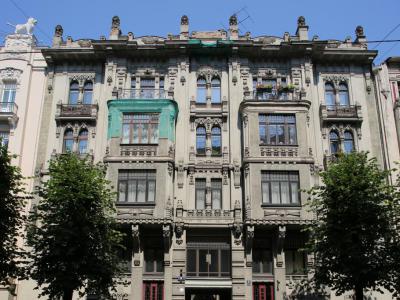 It is also the only building in which Eisenstein had used dark red and blue glazed tiles to decorate the façade. The latter abounds in geometric ornaments, none of which stands out, however, and is accentuated by the central avant-corps, which is surmounted with an attic – needed only for the placement of decorative elements: window apertures, mascarons and others.