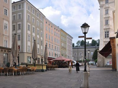 The Old Market in Salzburg is characterized by its medieval core and is flanked by a row of Baroque burgher houses, with influences from the early modern period evident in its architecture. Notably, Old Market No. 3, currently a bank, sits atop Roman foundations and features a late Baroque marble portal from a former pawnshop. Old Market No. 6 and 7 have housed the Old Court Pharmacy since the 16th century, with the latter still operating today. The pharmacy's original Rococo design and late Baroque window frames are preserved, alongside historical furnishings from the 18th century. Meanwhile, House No. 7, originally late Gothic, now sports a classicist façade and a memorial plaque for Carl Petter, a notable local pharmacist. Additionally, Café Tomaselli, at Numbers 9 and 10, is the oldest continuously operating café in Central Europe. Adjacent to it stands Salzburg's smallest house, a mere 1.42 meters wide, built between 1830 and 1860.