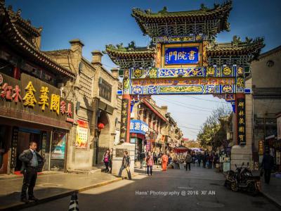The Shu Yuan Men Street is a small crowded street located behind the Forest of Steles Museum in Xian. The entrance is through an ancient gate called the South Gate. The street gets its name from the Guanzhong Shuyuan which was once a school for classical learning. Today, the Xian normal School and a primary school are located on the site of the old Guanzhong Shuyuan. The shops retain the old facades of buildings from the Ming and Qing Dynasties.
