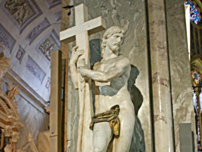 The former is found to the left of the main altar. The sculpture's first version, begun in 1515, was abandoned due to a flaw in the marble. The one we see today, completed in 1521, received acclaim for its artistry, particularly its lifelike knees. Originally, Michelangelo depicted Christ unclothed to symbolize his triumph over sin, however, a bronze loincloth was added in 1546.