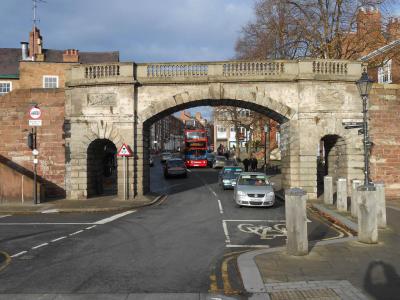 Bridgegate in Chester is a historic component of the city's ancient walls and is recognized as a Grade I listed building in the National Heritage List for England. Originally constructed by the 1120s, the gate formed part of a 12th-century extension of the Roman city walls along the north bank of the River Dee. Its strategic importance lay in guarding Chester's southern entrance, with the gateway serving as the passage for travelers from North Wales after crossing the Old Dee Bridge.