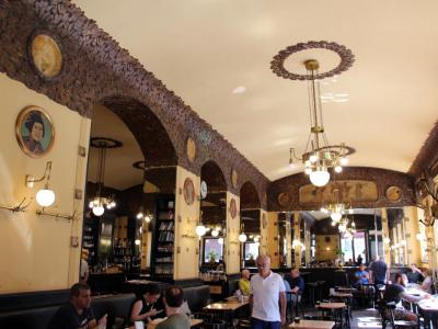 Step inside and you walk straight into the early 20th century. The décor is a manifesto of Art Nouveau and Vienna Secession-dark wood, red marble, chandeliers that shine like the sun, mirrors framed in brass, and frescoes overhead. After a full restoration in 2013, the café added a bookstore and reinvented itself as a cultural venue, where book launches and discussions now take place under the same chandeliers that once listened in on Joyce.
