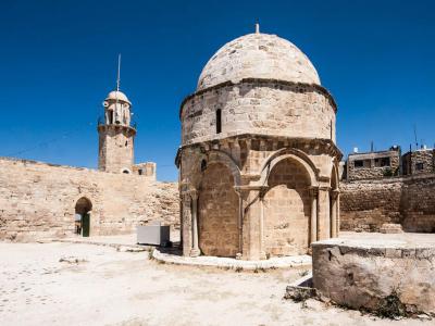 The adjacent tiny burial crypt is revered by adherents of all three Abrahamic religions: Jews believe it holds the prophetess Huldah from the 7th century BCE, Christians associate it with the 5th-century saint Pelagia the Harlot (or Penitent), and Muslims attribute it to the 8th-century Sufi mystic Rabi'a al-Adawiyya. What is certain is that the Christian tradition of Saint Pelagia is the oldest.