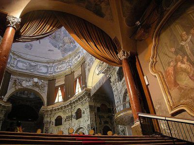 The interior, severely damaged during WWII Allied bombings, showcases a blend of restoration and preservation of its historical elements. It features precious Sicilian polychrome marbles and stuccoes, enhancing its rich Baroque character. The church houses three chapels, with notable artworks such as the dome fresco by Filippo Tancredi, the entrance staircase frescoes by Vito D'Anna, and a significant marble group in the apse. A 1725 painting by Cedri, depicting the Coronation of Santa Rosalia, links the church to local sainthood narratives, emphasizing its deep religious and cultural significance in Palermo.