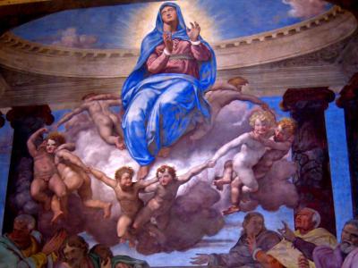 Upon stepping inside, the first chapel to the right catches the eye with its embellishments, featuring a "Baptism of Christ" and other paintings portraying the life of John the Baptist, created by Giambattista Naldini, a Florentine Mannerist painter. Moving to the third chapel on the right, one can admire an "Assumption of the Virgin" painted by Daniele da Volterra, another accomplished Mannerist painter and sculptor. Interestingly, da Volterra, who was a student of Michelangelo, is most famously remembered for his involvement in covering the genitals of figures in Michelangelo's "Last Judgment" with garments and loincloths after the master's passing. This earned him the nickname "Il Braghettone," meaning "the breeches maker."