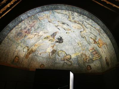 The surviving fragment-roughly 8.7 meters in diameter-is a richly detailed astrological diagram, painted on a quarter‑sphere vault. It portrays zodiac signs such as Leo, Virgo, Libra, Scorpio, and Sagittarius, alongside constellations like Hydra, Boötes, and Hercules. The Sun and Mercury are represented dramatically-one riding a chariot and the other atop an eagle‑drawn vehicle-reflecting the iconography of the Poeticon Astronomicon, referred in English as “The Poetical Astronomy”.