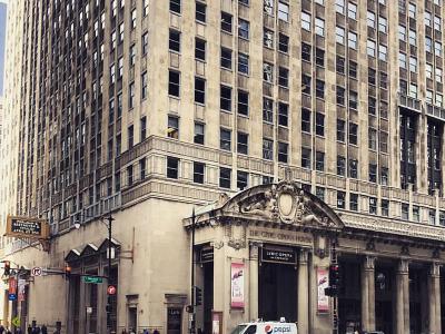 Conceived as a tribute to both culture and commerce, this building was finalized in 1929 and represents the final major real estate project undertaken by Samuel Insull, Chicago's magnate of traction and utilities. A grand two-story portico runs the entire length of the east facade, giving it the appearance of a colossal armchair when viewed from the river. Pediments mark the entrances to the theaters, with the smaller one having been converted to support space. Inside, the Grand Foyer soars to a height of forty feet and features a color scheme chosen by Jules Guerin, the mastermind behind the theater's fire curtain.