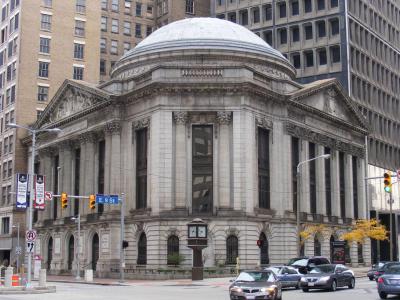 The Cleveland Trust Company Building, completed in 1907, stands as a majestic architectural landmark in downtown Cleveland. Blending Beaux-Arts, Neoclassical, and Renaissance Revival styles, this four-story structure was once the third-largest bank building in the United States. It is celebrated for its ornate exterior sculpture, impressive stained glass dome, and mural paintings, making it one of the most visually stunning bank buildings of its time.