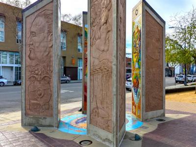 Created by Wayne Alaniz Healy and David Rivas Botello, founders of the Los Angeles based art collective East Los Streetscapers, and sculptor Alejandro De La Loza, this concrete and bronze sculpture features murals and bas-relief sculpture depicting the 1777 establishment of San José as the first civilian Spanish settlement in California. Painted in the group’s colorful signature style, which emerged from the Chicano Mural Movement of the 1960s-70’s, the murals depict the day-to-day lives of the unnamed settlers from their agricultural prowess to their adobe homes.