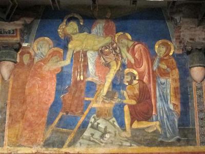 Inside, there are thirteenth-century frescoes known for their vibrant colors, preserved due to being sealed shortly after creation. These frescoes depict biblical scenes in two tiers: the upper tier shows Old Testament scenes, while the lower tier features New Testament stories, including scenes of the Passion of Christ. The frescoes offer insight into medieval art and the Sienese school of mural painting. Ongoing studies aim to precisely date and attribute them, which could greatly contribute to medieval art history.