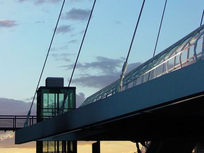 The bridge was named to commemorate a milestone in time-the turn of the millennium-and Denver's advancement in architectural design. Spanning 130 feet (40 meters) without requiring a significant elevation change, the bridge's structure is a marvel of engineering. To achieve the necessary stability while maintaining a thin profile, the bridge employs a single tilted mast, standing 200 feet (61 meters) tall, that acts as a lever to create supportive tension across the deck. Steel cables are attached to both sides of the mast, with some anchoring it to the foundation, ensuring the bridge's structural integrity.