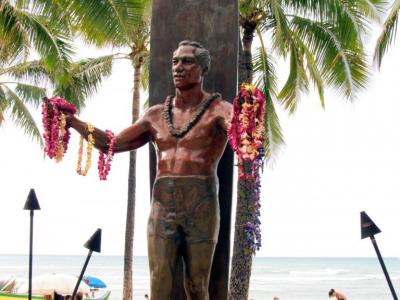 In 1990, the City of Honolulu honored Kahanamoku's memory by erecting a 9-foot bronze statue at the Waikiki Beach burial site. The statue, created by Jan Gordon Fisher, depicts Kahanamoku with outstretched arms, standing in front of his surfboard. It is surrounded by honorary Hawaiian spears and features a dedication plaque and an information marker. Initially, there was some criticism of the statue's orientation, with Kahanamoku's back to the sea, as it was seen as contrary to Hawaiian custom. However, the statue has become highly popular and is regularly adorned with fresh flowers.