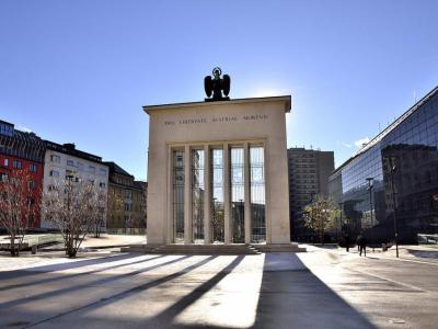 After the war, the French occupiers thought it would be a good place for a Liberation Monument, designed by French Major Jean Pascaud. The monument mimics the front facade of the Landhaus building. It has five open spaces between flat columns. The columns are held within a squared arch.