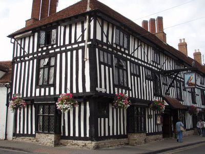 The first thing that strikes one walking across the medieval center of Stratford-Upon-Avon is the abundance of timber-framed Tudor houses. Their most notable feature, often combined with an overhanging upper story, is an exposed wooden framework; the rest is typically filled with brick, plaster or wattle-and-daub.
