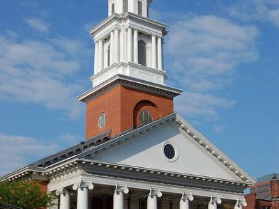 Standing just beyond the northwest corner of the New Haven Green, First and Summerfield United Methodist Church is a striking landmark, housed in a historic brick building adorned with tall white Ionic columns, a grand staircase entrance, stained glass windows, and a soaring steeple. This prominent site has long been a hub for worship, community, and justice in downtown New Haven.