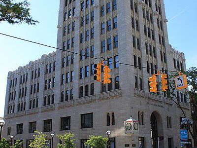 The First National Bank Building is a ten‑story limestone- and terra-cotta‑clad structure that first crowned the city skyline upon its completion in 1930. Designed by local architects Fry and Kasurin between 1927 and 1930, it rose as Ann Arbor’s tallest building and was celebrated for its refined blend of Art Deco, Streamline Moderne, and subdued Romanesque revival detailing-including broad terra-cotta verticals, decorative gargoyles, and a dignified cornice that crowns the tower.