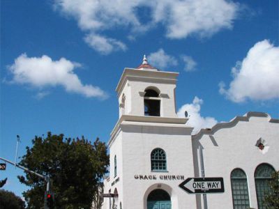 Grace Church has been part of San Luis Obispo’s downtown fabric since the early 1930s. The main building reflects a Colonial Revival style, with a white-painted exterior, balanced proportions, and minimal decorative detailing. Its symmetrical façade and simple design align with early 20th-century American church architecture, favoring function and familiarity over grand expression. The structure’s presence is steady rather than dominant, and it remains one of the recognizable features among the area’s traditional streetscape.