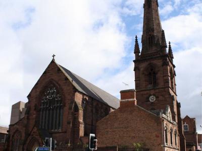 The Guildhall, built of red sandstone with grey slate roofs, features a continuous nave and chancel with a clerestory, a west porch, a south spire and porch, and a vestry. Its three-stage tower includes double doors, a relief of Christ enthroned, clock faces, lancet windows, bell openings, corner buttresses, a pierced parapet, and an octagonal spire with lucarnes.