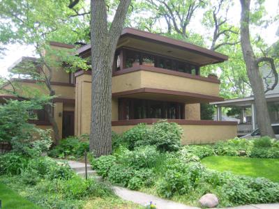 The architectural design of the Gale House is modest yet impactful, with its innovative use of space and structure. The entrance, subtly hidden behind a tall pier, opens into a hall dominated by a massive Roman brick fireplace, which artfully separates the hall from the living room. Built-in shelving and slightly elevated dining room floors, along with dramatically cantilevered balconies, are distinctive features that showcase Wright's skill in integrating interior spaces with external forms. The house's second story, which includes four bedrooms and a maid’s room, is enhanced by a cantilevered balcony that joins the north-facing bedrooms, offering a unique architectural element that presages some of Wright's later, more famous works.