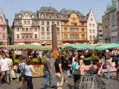 Market Square is Mainz's most popular square and is dominated by the iconic Mainz Cathedral. The square became a popular trading place when the cathedral was built in 975. Traditionally, merchants offered wool, cloth, fur, baked goods, and fruit and vegetables. Products were set out in large baskets on the floor.