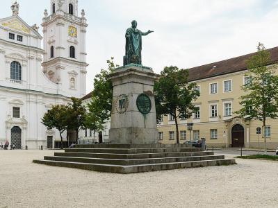 The Max Monument is a bronze statue erected between 1824 and 1828 in Passau's cathedral square that honors Bavaria's first King, Maximilian Joseph I. The monarch's regal attire and outstretched left arm, fondly seen as a "rain test," earned it the local name "rain tester." With a downward-pointing scepter, the king rests on a cuboid inscribed with "Charta Magna," symbolizing the 1818 Bavarian constitution, topped by the royal crown.
