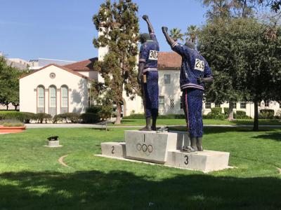 Designed by artist, Rigo 23, this larger-than lifesize fiberglass and mosaic monument, centrally placed on San José State University’s Tower Lawn, depicts the heroic and symbolic action of two African-American athletes and San José State University alumni, Tommie Smith and John Carlos, who, during the medal ceremony for the 200-meter running final in the Olympic Stadium in Mexico City on October 16, 1968, performed the Black power salute, raising their fists in silent protest. Smith, in the first place spot and Carlos, in third, planned and executed the gesture to draw attention to injustice and inequality faced by Black Americans but were greeted with boos and threats from the audience. Rendering the iconic moment through details such as the gloved hands and shoeless feet of the two athletes, Rigo 23 shows that the gesture was not accidental but planned for maximal symbolic effect.
