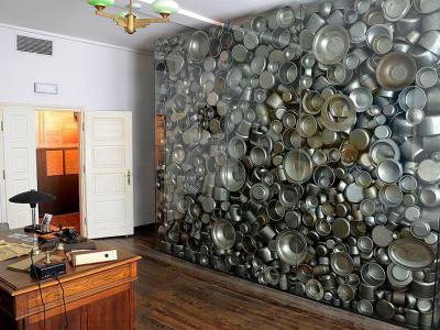 On the third floor, after progressing through several rooms, you will arrive at a hall depicting everyday life between 1941 and 1943. Two rooms are located on the right side of this hall. The second room is the more significant one—Schindler’s office—which features the famous glass installation ''Survivors’ Ark,'' filled with enamelware produced by the factory. After leaving the office and passing through three additional rooms, you will reach the Płaszów Concentration Camp Room. You will recognize it by its circular layout and the wooden gate reinforced with barbed wire. As its name suggests, the room is a re-creation of elements of the Płaszów camp and is designed to convey its tense, oppressive atmosphere.