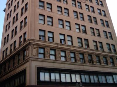 Constructed with a steel frame, the exterior of the Park Building is predominantly dressed in limestone, contributing to its imposing and elegant facade. The first two floors feature metal and plate glass storefronts, catering to commercial activities, while the third floor showcases evenly spaced windows separated by decorative limestone panels and topped with a cornice. This intricate detailing gives way to simpler designs on the middle floors, from the fourth to the ninth, where minimal decoration underscores the building’s functional purpose.