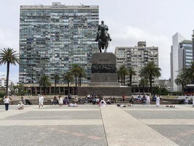 The Artigas monument dominates the center of Independence Square. Large green areas cover each of the four rounded corners of the Square. The place is surrounded by a broad and heavily trafficked motorway.