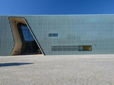 The museum is located on the site of the former Warsaw Ghetto. It was designed by architects Rainer Mahlamäki and Ilmari Lahdelma in a Postmodern Architectural style using concrete, copper and glass. The imposing, box-shaped building stands in contrast to the surrounding green space where it sits. The award-winning building is illuminated at night in multiple colors.