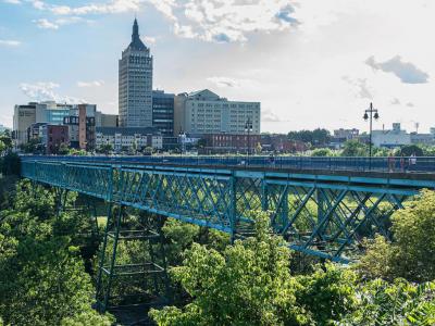 The Pont de Rennes Pedestrian Bridge is one of Rochester's most famous landmarks. This 1891 bridge, initially designed for car traffic, has been a pedestrian bridge since 1982. The street where this bridge was located was Platt Street, and the current name comes from Rennes, Rochester's sister city in France.