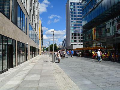 The Centrum-Galerie features a remarkable aluminum facade with a unique honeycomb design that echoes the original Centrum department store's design. The UFA Crystal Palace was built in 1998 and features a dramatic design using glass and concrete.