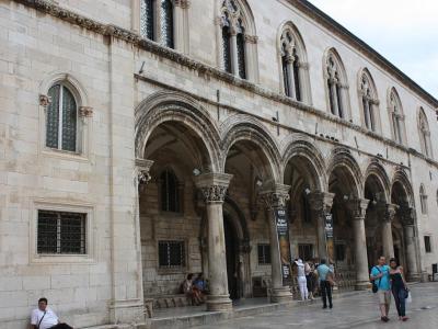 Located just south of Luza Square, the palace, like the city, has been ravaged many times by wars, earthquakes, fires, and sieges. Its style is Gothic, with reconstructions involving Renaissance and Baroque influences. The palace got its current form, including the atrium and front portico, after the explosion of 1463.