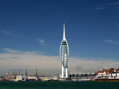 Spinnaker Tower is a 560-foot-high observation tower in Portsmouth Historic Dockyard. It is the main component in the redevelopment of Portsmouth Harbour. It is tall enough to be seen from the Isle of Wight, Worthing, and Dorset. Two wide white metal arcs create the image of an inflated spinnaker sail.