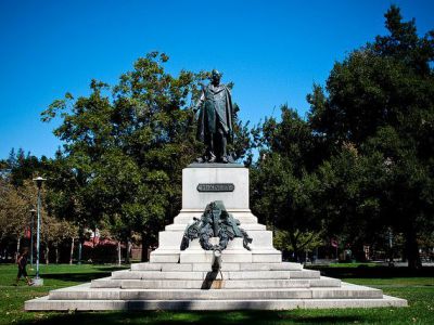 Saint James Park spans 6.8 acres in Downtown San Jose and dates to 1848. One of the park's oldest landmarks is a monument to president William McKinley, dating back to 1903. The sculpture stands on a granite pedestal and is crafted of bronze. There is also a brass cannon that stands at the monument's foot.