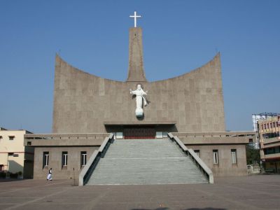 The architecture of Saint Joseph’s Cathedral is modern, standing out from more traditional church designs in India. The upper façade is shaped like a giant crescent crowned by a tall column and topped with a imposing cross. At its center is a large statue of Jesus Christ with outstretched arms welcoming visitors. Inside, the first-floor prayer hall is spacious, with pews aligned and stained-glass windows.