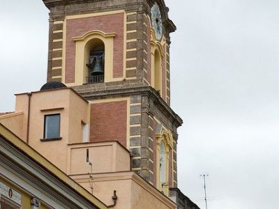 The Bell Tower of the Cathedral in Sorrento is a prominent landmark that rises three stories above the surrounding buildings. Its unique red and yellow stone facade makes it easily recognizable from various points in the town's historic center.