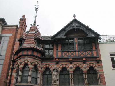 The façade is a feast of intricate design and symbolic tribute. Red brick meets black timber in ornamental arrangements, punctuated by polychrome brickwork and carved stone. High above the entrance, a statue of a medieval architect holds rolled plans beside a miniature cathedral-widely thought to be a self-reflective homage by Fothergill. Below, busts of his heroes-Augustus Pugin and George Edmund Street-flank the elevation, with the names of George Gilbert Scott, William Burges, and Richard Norman Shaw inscribed, cementing his admiration for the great minds of British Gothic.