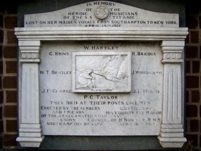 The memorial honors Wallace Hartley (violin), Roger Marie Bricoux (cello), Theodore Ronald Brailey (piano), John Wesley Woodward (cello), John Frederick Preston Clarke (string bass, viola), John Law Hume (violin), Percy Cornelius Taylor (piano), and Georges Alexandré Krins (violin). Their courage and dedication to their craft, even in the face of death, remain an enduring symbol of human dignity.