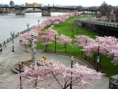 The walking trail in Waterfront Park along the Willamette River has been popular since the park was opened in 1978, replacing Harbor Way and former industrial sites. A major milestone in the freeway removal movement, it is now primarily used by those taking a stroll, jogging, biking, or riding scooters. Beautiful in every season and in all types of weather, it becomes an absolute must with spring arriving to witness pastel-pink cherry trees bursting into bloom. In October 2012, the American Planning Association voted it as one of America's ten greatest public spaces.