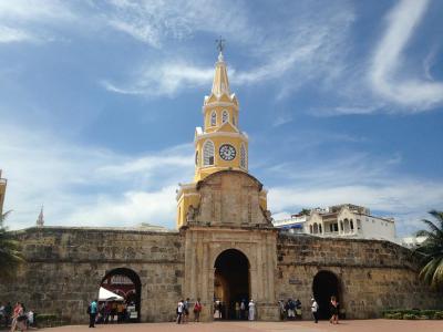 The main entrance to the historic walled city of Cartagena is famously known as the Clock Tower (Torre del Reloj). This significant landmark, built into the city wall, features a trio of open archways that offer a gateway into the Old City. A stunning clock tower crowns the central arch. With Baroque architecture, this beautiful eight-sided tower is painted golden-yellow with white trim.