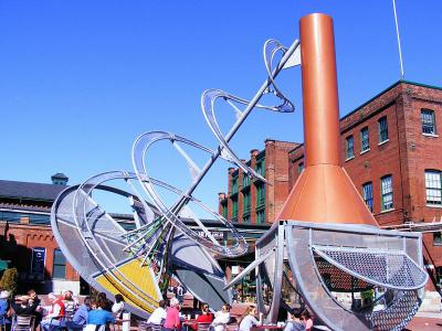 The Distillery streetscapes are adorned with several impressive sculptures placed along the lanes. Notably, three sculptures grace Distillery Lane, while another sculpture can be found at the parking area located at the end of Trinity Street. Standing proudly in the heart of the square is "Still Dancing," a remarkable 50-foot-tall steel artwork created by renowned American artist Dennis Oppenheim. This distinctive sculpture has become a well-known landmark in Toronto.