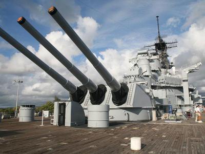 The USS Missouri was commissioned in 1944, and fought in both the battles of Iwo Jima and Okinawa, in the Korean War between the years 1950 and 1953, and then in Operation Desert Storm in 1991. All told, the Missouri received a total of eleven service stars before being decommissioned in 1992. In 1998, the ship was donated to the USS Missouri Memorial Association for use as a museum ship. One of the ship's trademarks is her nine 16-inch guns. The barrel of each one is roughly 67 feet long and weighs over 115 tons.