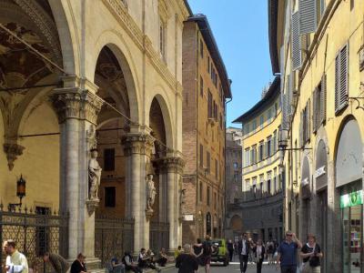 Of the three main streets of old Siena, the City Street has the most stately and elegant buildings in the city. Among the beautiful buildings along the City Street are: the Patrizi Place that dates back to the 14th century; the music academy at the Chigi-Saracini Palace; the Palace of Papesse, a Florentine renaissance style building that houses a contemporary arts center; the Gothic style Marsili Palace and the Loggia of Mercanzia, the Sienese equivalent of a chamber of commerce.